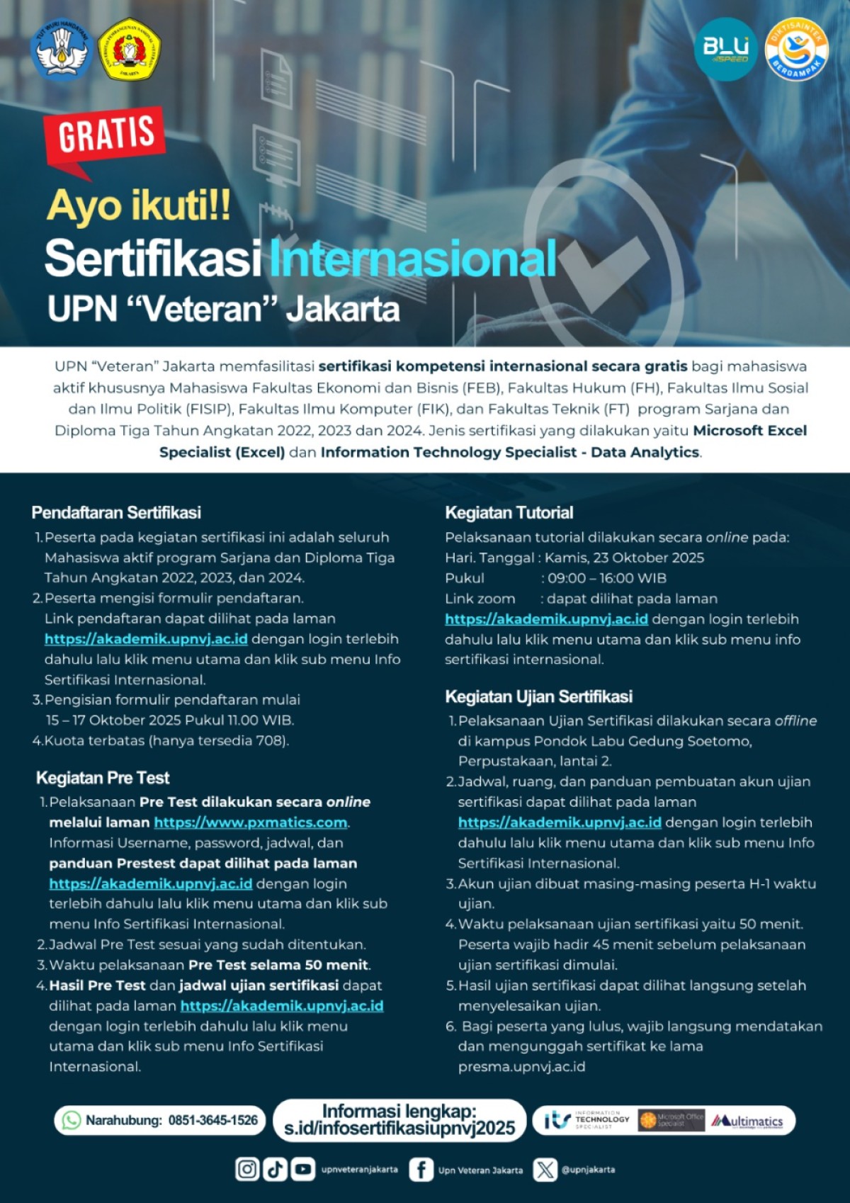 FT UPNVJ – Universitas Pembangunan Nasional “Veteran” Jakarta (UPNVJ) membuka kesempatan bagi mahasiswa aktif untuk mengikuti Sertifikasi Kompetensi Internasional secara gratis. Program ini ditujukan bagi mahasiswa program sarjana dan diploma tiga dari Fakultas Ekonomi dan Bisnis (FEB), Fakultas Hukum (FH), Fakultas Ilmu Sosial dan Ilmu Politik (FISIP), Fakultas Ilmu Komputer (FIK), dan Fakultas Teknik (FT) angkatan 2022, 2023, dan 2024.
