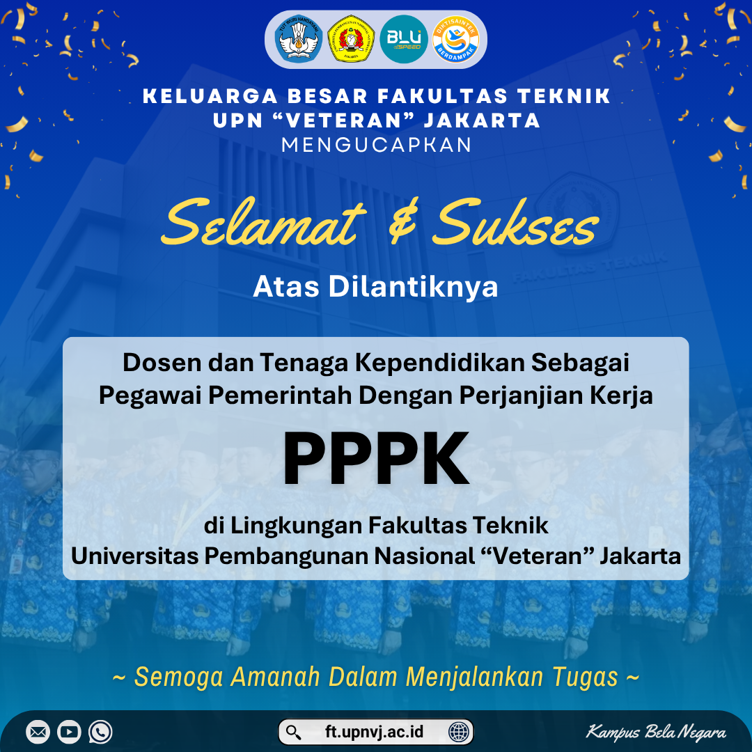 FT UPNVJ – Keluarga Besar Fakultas Teknik Universitas Pembangunan Nasional “Veteran” Jakarta (UPNVJ) mengucapkan selamat dan sukses atas dilantiknya Dosen dan Tenaga Kependidikan di lingkungan Fakultas Teknik sebagai Pegawai Pemerintah dengan Perjanjian Kerja (PPPK).