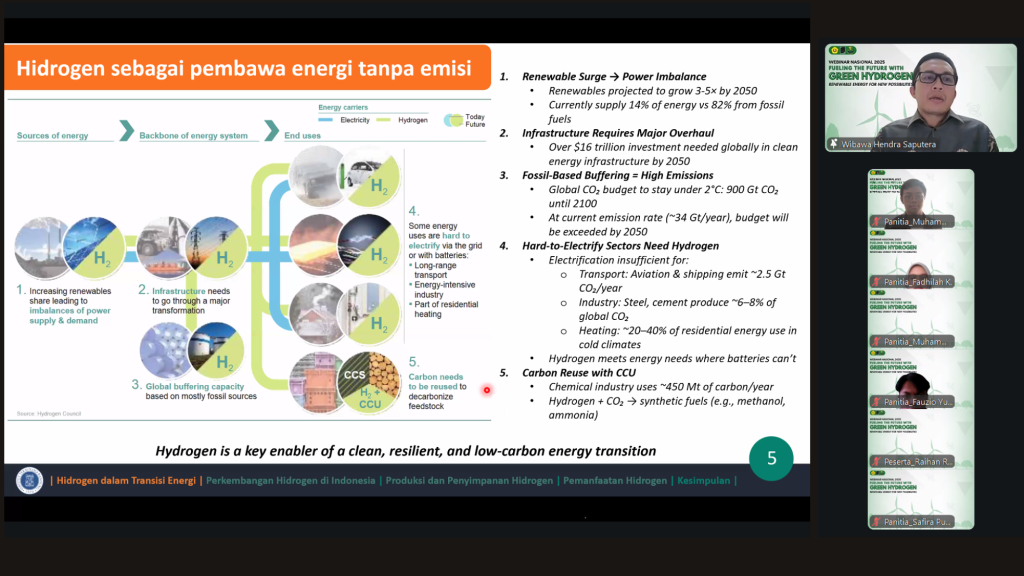 Webinar ini menghadirkan narasumber ahli, Wibawa Hendra Saputera, S.Si., M.Si., M.Sc., Ph.D., dosen sekaligus Asisten Profesor dari Institut Teknologi Bandung, yang dikenal aktif dalam riset energi baru terbarukan dan teknologi hidrogen.