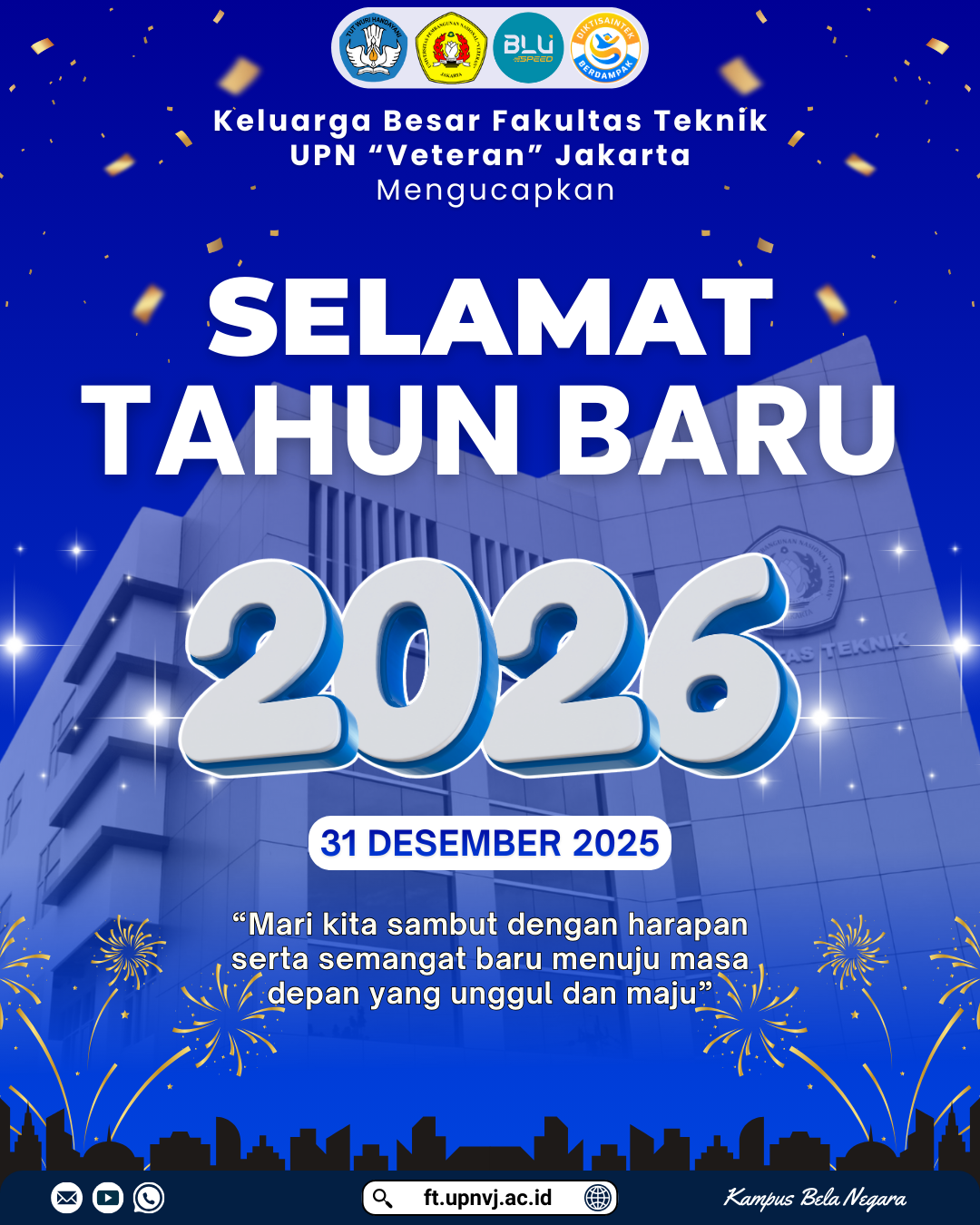 FT UPNVJ – Keluarga Besar Fakultas Teknik Universitas Pembangunan Nasional “Veteran” Jakarta (UPNVJ) mengucapkan Selamat Menyambut dan Merayakan Tahun Baru 2026. Mari kita sambut dengan harapan serta semangat baru menuju masa depan yang unggul dan maju.