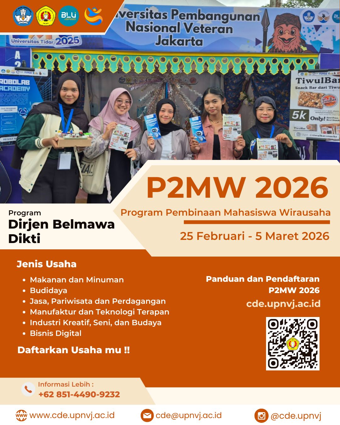FT UPNVJ – Ayo mahasiswa Universitas Pembangunan Nasional “Veteran” Jakarta (UPNVJ) ikuti Program Pembinaan Mahasiswa Wirausaha (P2MW) Tahun 2026. Jika kamu punya bisnis atau baru punya ide usaha? Inilah saatnya kamu unjuk diri!