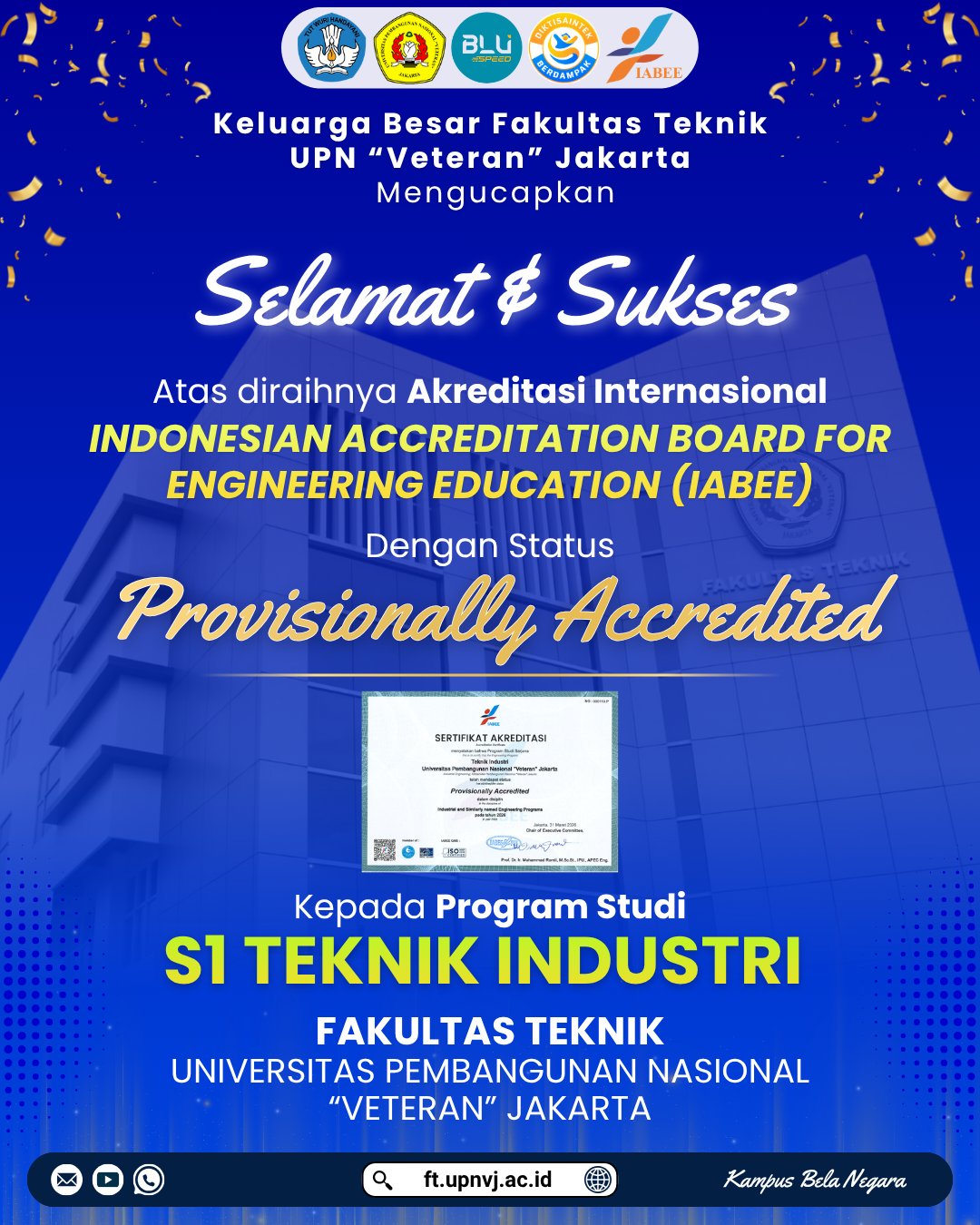 FT UPNVJ – Keluarga besar Fakultas Teknik Universitas Pembangunan Nasional “Veteran” Jakarta (UPNVJ) mengucapkan Selamat kepada Program Sarjana Teknik Industri UPNVJ atas diraihnya akreditasi internasional Indonesian Accreditation Board for Engineering Education (IABEE) dengan status Provisionally Accredited (PA) dalam disiplin Industrial and Similarly Named Engineering Programs pada tahun 2026.