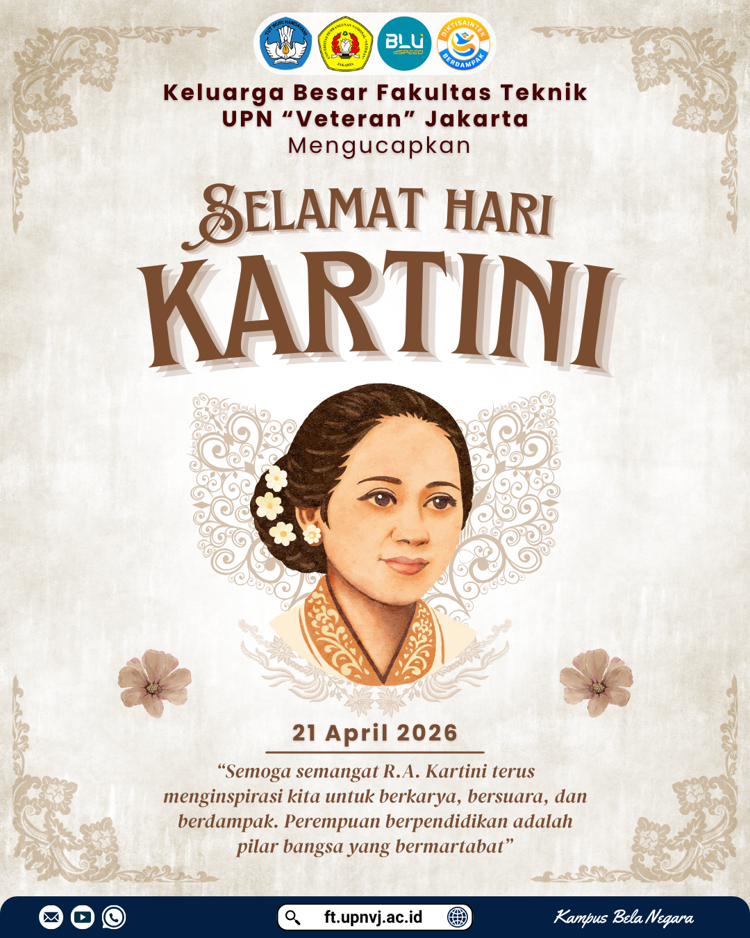 FT UPNVJ – Keluarga besar Fakultas Teknik Universitas Pembangunan Nasional “Veteran” Jakarta (UPNVJ) mengucapkan Selamat Hari Kartini 21 April 2026. Semoga semangat Raden Ajeng Kartini terus menginspirasi kita untuk berkarya, bersuara, dan berdampak. Perempuan berpendidikan adalah pilar bangsa yang bermartabat.