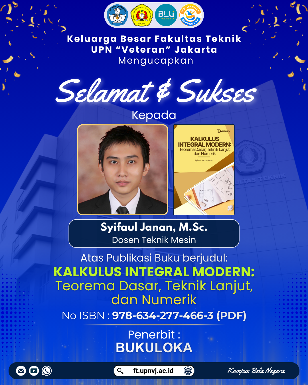 FT UPNVJ – Keluarga Fakultas Teknik Universitas Pembangunan Nasional “Veteran” Jakarta (UPNVJ) mengucapkan selamat dan sukses kepada Syifaul Janan, M.Sc., dosen teknik mesin atas publikasi buku berjudul “Kalkulus Integral Modern: Teorema Dasar, Teknik Lanjut, dan Numerik” (ISBN: 978-634-277-466-3 -PDF) yang diterbitkan oleh Bukuloka.