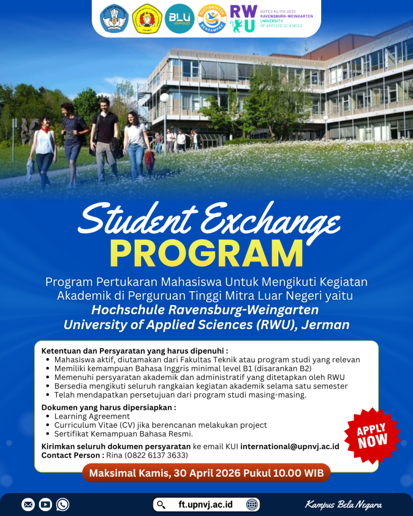 Halo Mahasiswa Fakultas Teknik Universitas Pembangunan Nasional “Veteran” Jakarta (UPNVJ)! Kesempatan emas untuk merasakan pengalaman belajar di luar negeri kini…