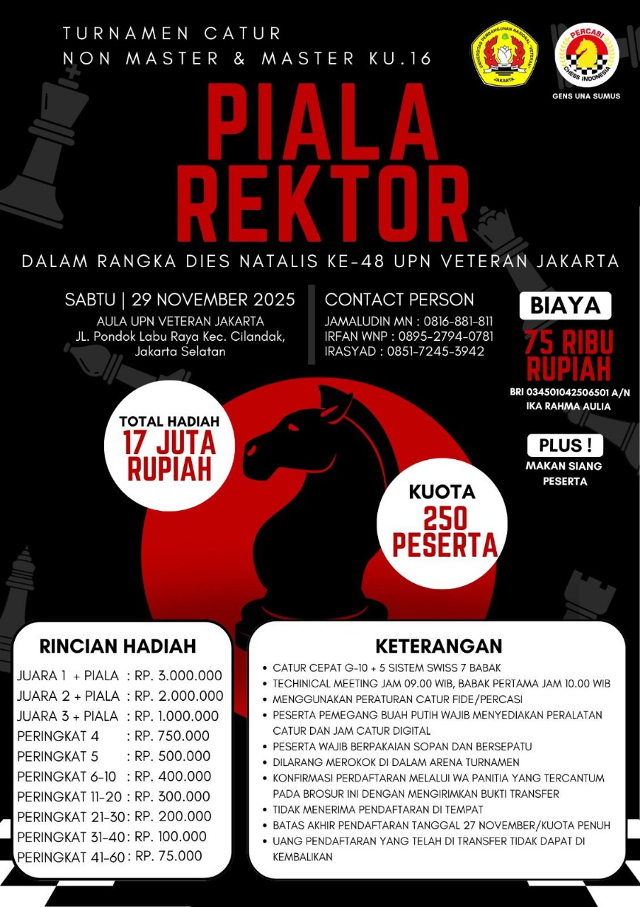 FT UPNVJ – Dalam rangka memeriahkan Dies Natalis Ke-48 Universitas Pembangunan Nasional “Veteran” Jakarta (UPNVJ), kami mengundang seluruh civitas akademika untuk berpartisipasi dalam Turnamen Catur “PIALA REKTOR”. Kegiatan ini...
