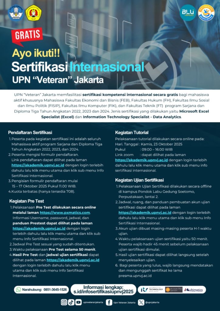 FT UPNVJ – Universitas Pembangunan Nasional “Veteran” Jakarta (UPNVJ) membuka kesempatan bagi mahasiswa aktif untuk mengikuti Sertifikasi Kompetensi Internasional secara…