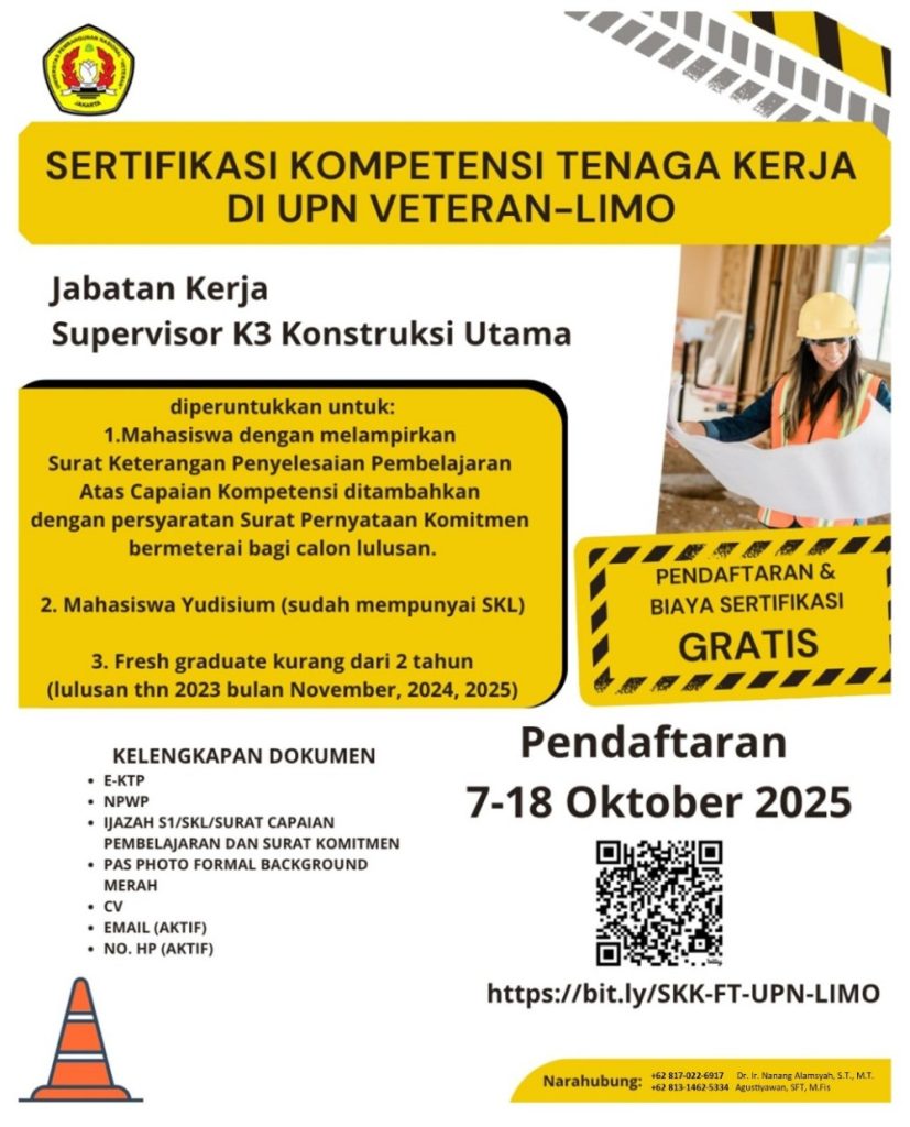 FT UPNVJ – Universitas Pembangunan Nasional “Veteran” Jakarta (UPNVJ) akan menyelenggarakan kegiatan Sertifikasi Kompetensi Tenaga Kerja Konstruksi yang ditujukan bagi...