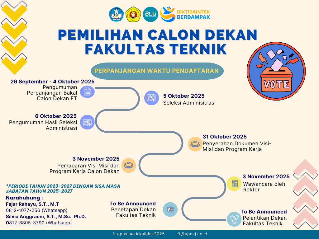Syarat Calon Syarat Calon Dekan Fakultas Teknik UPN “Veteran” Jakarta Periode 2023-2027dengan Masa Sisa Jabatan Tahun 2025 – 2027 Click here Tahapan Tahapan Pemilihan Dekan Fakultas Teknik UPN “Veteran” Jakarta Periode 2023-2027 dengan Masa Sisa Jabatan Tahun 2025-2027 Click here Jadwal Jadwal Pemilihan Dekan Fakultas Teknik UPN “Veteran” Jakarta Periode 2023-2027 dengan Masa Sisa Jabatan Tahun 2025-2027 Click here Download Download Berkas Kelengkapan Pendaftaran Calon Dekan Fakultas Teknik Periode 2023-2027 dengan Masa Sisa Jabatan Tahun 2025- 2027 Click here